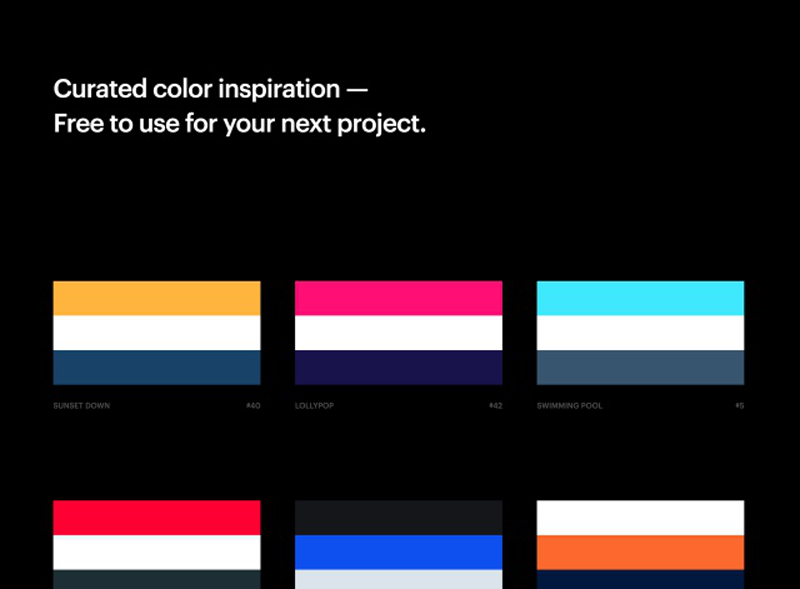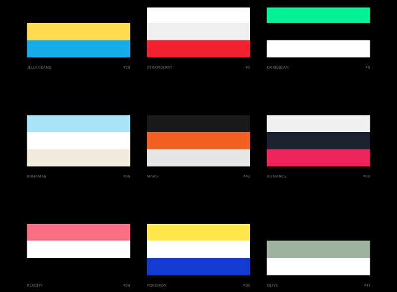 開啟 Colorinspire.io 網(wǎng)站后可以看到各個(gè)顏色組合,目前約有45 種,每一個(gè)組合都由三種顏色構(gòu)成,下方還會有配色名稱和編號。