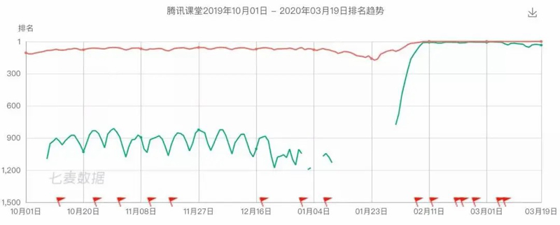 此外,疫情期間,騰訊還有一匹黑馬——騰訊課堂,這個推出多年的APP在AppStore之前一直徘徊在1000名左右,疫情爆發(fā)后迅速躥高,最高到達(dá)了第5名的高位。