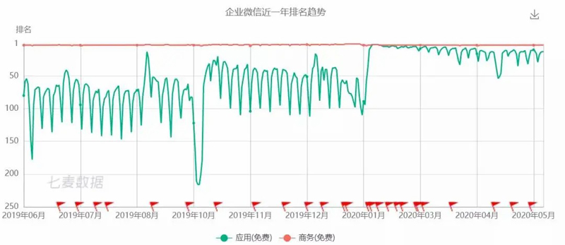 根據(jù)七麥數(shù)據(jù)的排名,我們看到企業(yè)微信在AppStore的排名從疫情之前的100名左右迅速上升到第1名、第2名,并且維持這個排名長達(dá)幾個月;