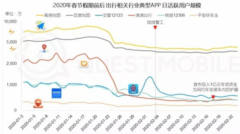 根據(jù)Questmobile數(shù)據(jù),滴滴日活用戶從疫情之前的超2000萬下降到不足500萬——同樣下降的還有高德、百度等地圖應(yīng)用。