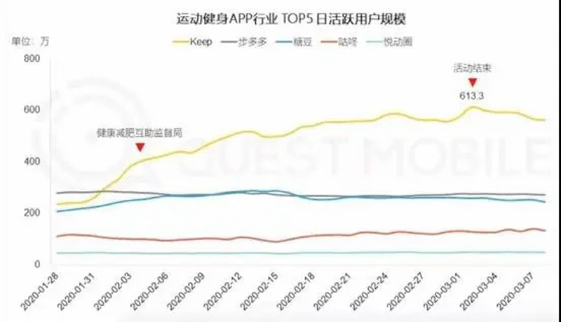 而根據(jù)Questmobile的數(shù)據(jù),Keep的日活從200多萬增長到了最高613.3萬,增速極其明顯——這和它主打室內(nèi)運動的特點有直接關(guān)系,咕咚等以室外跑步的APP就沒有那么幸運了。